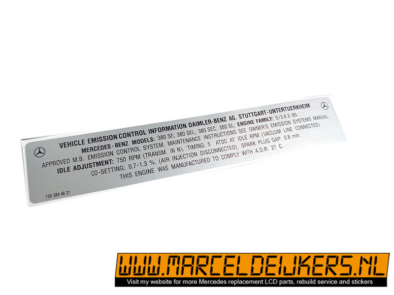 Sticker which replace the old sticker with partnumber: 1265844621 - 126 584 46 21 for R107 and W126 series with the M117.968 engine.
