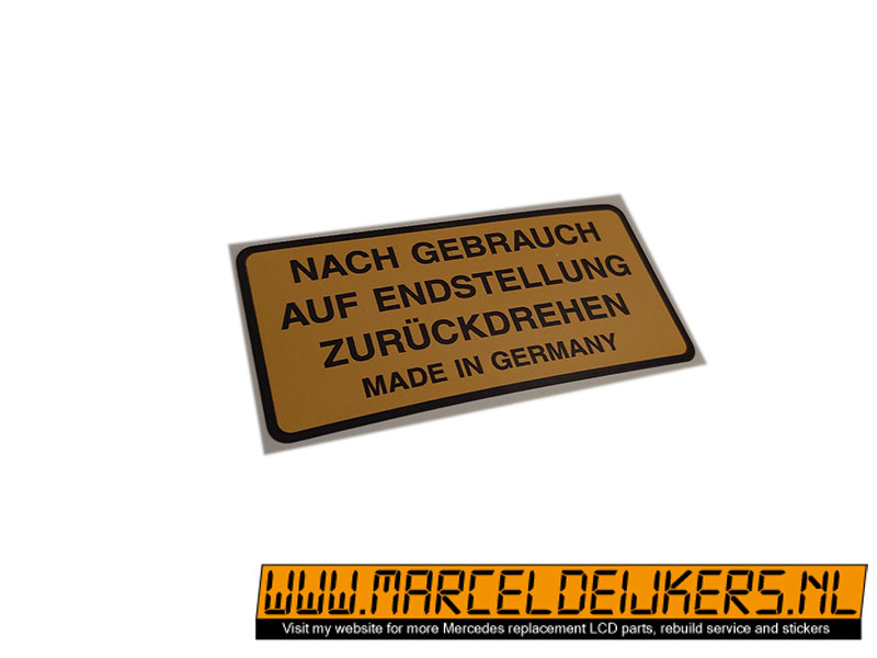 This sticker has been reproduced in the same sizes, shapes and colors to match the old original one which is NLA at mercedes.