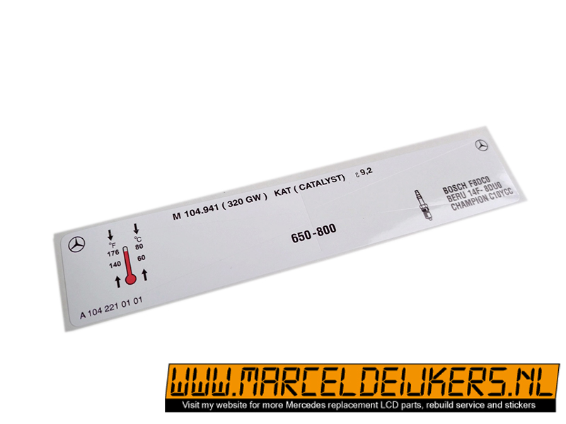 Mercedes-Benz M104 engine sticker with partnumber: A1042210101 - A 104 221 01 01 - N104.941 320GW KAT