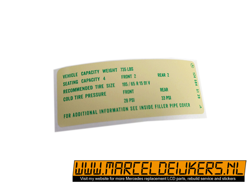 Sticker which replace the old sticker with partnumber: 1245845139 - 124 584 51 39 Tire pressior reifendruck sticker decal