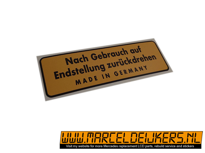 This sticker has been reproduced in the same sizes, shapes and colors to match the old original one which is NLA at mercedes.