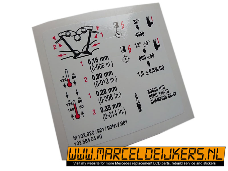 Mercedes engine information sticker decal with partnumber: 1025840440 / 102 584 04 40 / M102.920 / M102.921 / M102.961 / M102.93NV and the Apal Francochamps