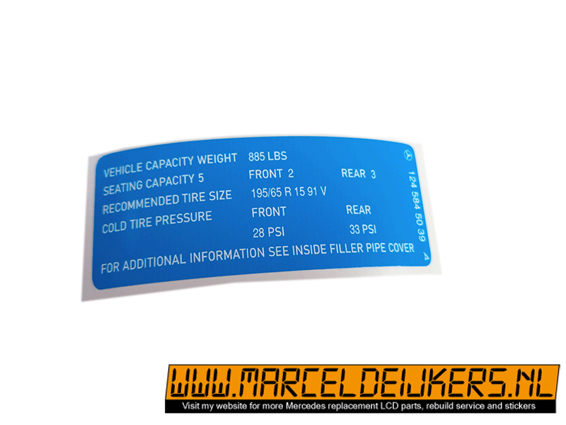 Sticker which replace the old sticker with partnumber: 1245845039 - 124 584 50 39 Tire pressior reifendruck sticker decal