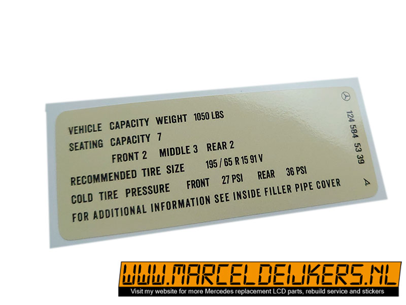 This sticker has been reproduced in the same sizes, shapes and colors to match the old original one which is NLA at mercedes.