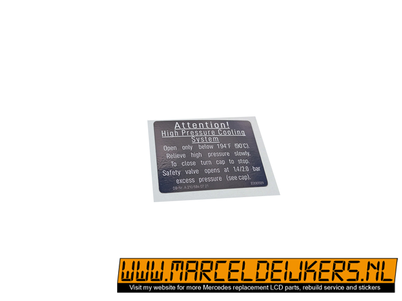 Sticker which replace the old sticker with partnumber: A2105840721 - A 210 584 07 21 E000029 Attention! High pressure cooling system